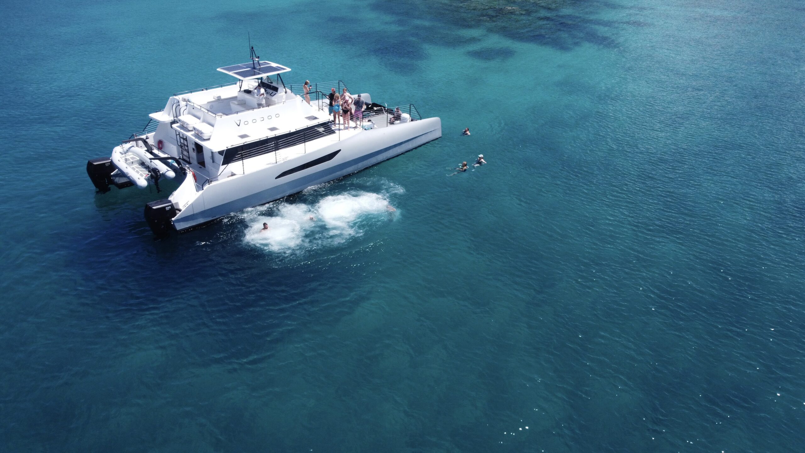 A 57-foot custom power catamaran with upper-deck views, two full bathrooms, a central bar, easy water stairs, plenty of lounging space, and our signature water swings.